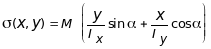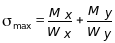 На основании принципа независимости действия сил нормальное напряжение в произвольной точке, принадлежащей к поперечному сечению бруса и имеющей координаты x, y, определяется суммой напряжений, обусловленных моментами Mx и My , т.е.