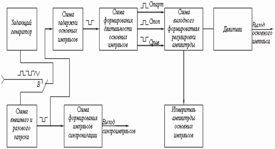 Схема формирования импульсов синхронизации выдает синхроимпульсы обеих полярностей. Ч/з коммутирующий элемент синхроимпульсы поступают на вых гнездо ген-ра. Схема задержки основного импульса выдает импульс с регулируемым временным сдвигом, а также обеспечивает режим нулевого временного сдвига основного импульса относительно импульса синхронизации ген-ра. Импульс с выхода схемы задержки основного импульса запускает схему формирования длительности основных импульсов, кот выдает стартовый и столовый импульсы с регулируемым временным сдвигом м/у ними. Поступая на схему вых формирования и регулировки амплитуды, стартовый импульс определяет начало (фронт) вых основного импульса, а стоковый - его конец (срез). Со схемы формирования длительности основных импульсов на схему вых формирователя поступает также импульс срыва, совпадающий во времени со стоповым импульсом и обеспечивающий быстрое восстановление схемы вых формирователя в исходное состояние. Схема вых формирователя и регулировки амплитуды обеспечивает формирование прямоуг импульсов с max амплитудой, определенной длительностью, частотой повторения на согласованной внешней нагрузке. Вых импульс м. плавно-ступенчато регулироваться по амплитуде от Umax до 0,01 Umax. Ч/з коммутационный элемент выходной импульс со схемы вых формирователя поступает или на вых гнездо 1:1, или на делители, дополнительно ослабляющие амплитуды импульсов в 10 и 100 раз.