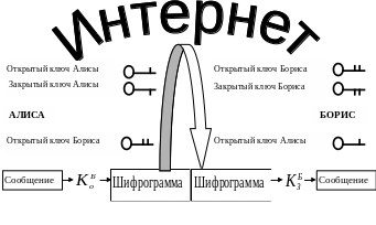 Сообщение, отправляемое любым участником переписки определённому получателю, шифруется открытым ключом этого получателя. Например, АЛИСА, отправляя сообщение БОРИСУ, использует его открытый ключ (рисунок 5).