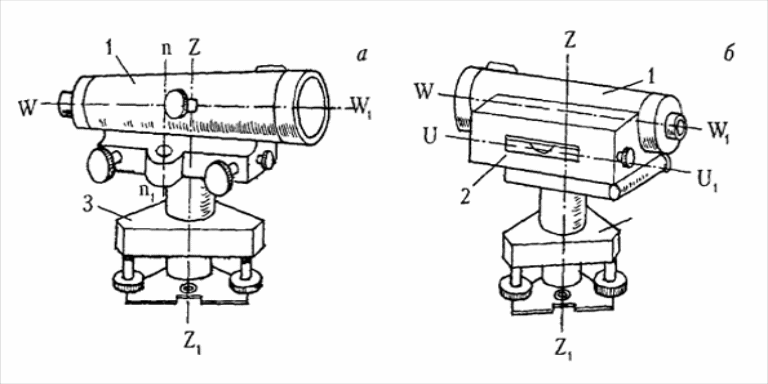 Рис.7.1. Устройство нивелира: 1–зрительная труба, 2–цилиндрический уровень, 3–подставка; Z–Z1 – ось вращения нивелира, W–W1 – визирная ось, U–U1 – ось цилиндрического уровня