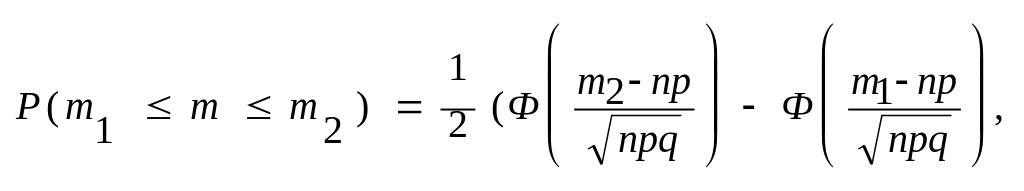 Т.: Пусть проведено n повторных независимых испытаний, в каждом из которых некоторое событие А наступает с вер-тью р, причём. 1)число испытаний достаточно велико. 2)Значение npq20. ; Тогда вер-ть того, что число m наступлений событий А в этих испытаниях окажется заключено в границах от m1 до m2 вычисляется по след. приближ. ф-ле.