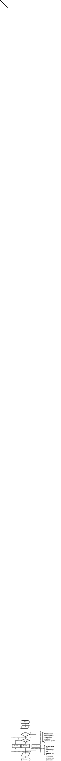 Здесь в линейную структуру вложена ветвящаяся, ветвь «нет» которой, в свою очередь, составляет еще одна ветвящаяся структура. Глубина вложения такой ветвящейся структуры равна 2.