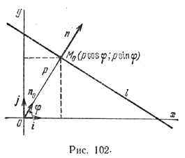 Пусть М0 — точка пересечения прямой l и перпендикулярной ей прямой, проходящей через начало координат, п0 — единичный нормальный вектор прямой l, т. е. |п0| = 1. Координаты точки М0 и вектора п0 выражаются через заданные величины р и φ следующим образом: