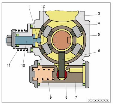 1 – шток с шаровой головкой; 2 – продольная канавка; 3 – корпус насоса; 4 – роликовое кольцо; 5 – ролик; 6 – шток; 7 – поршень; 8 – шарнир; 9 – пружина; 10 – ось; 11 – возвратная пружина