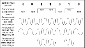 В аналоговых линиях связи для передачи непрерывных сигналов используется так называемый несущий сигнал - синусоиду (непрерывный сигнал постоянной частоты, которая называется несущей частотой). Передача дискретных данных по этим линиям осуществляется изменением (модуляцией) характеристик несущего сигнала.