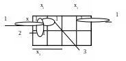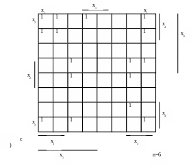 На Рис. 2.2.4 .9c) приведена карта Карно для шести переменных. В этой карте приведен пример расположения четырех геометрически соседних клеток с единичными значениями, которые нельзя объединить единым контуром (1). Эти, рядом лежащие клетки, необходимо охватить двумя контурами (2, 3). Действительно конъюнкция для неправильного контура 1 имеет вид: