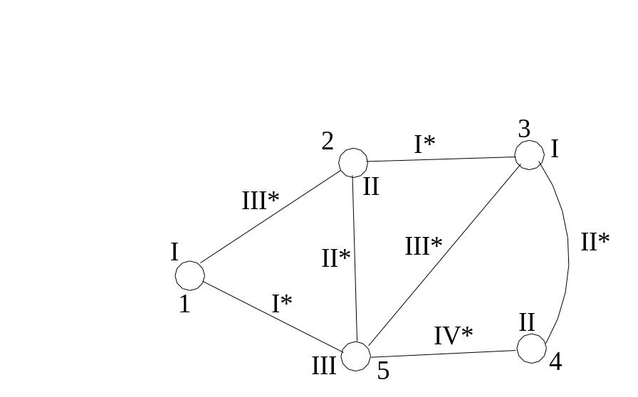 1.Рассмотрим вершинную раскраску. Из Утверждений 1,2 следует, что l(G) n, 3 (G) 5. Полученная оценка по-казывает, что минимальное количество цветов, необхо-димых для правильной раскраски, лежит в интервале от 3 до 5. Поскольку правильная раскраска вершин тремя цветами (I,II,III) существует (она показана на изображении графа), то отсюда следует, что (G)=3.