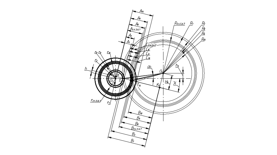 Проведенные построения завершают разработку расчетной схемы. При использовании графического метода проектирования, следующим шагом является измерение радиусов R1. При использовании аналитического метода, следующим шагом является выполнение коррекционного расчета.