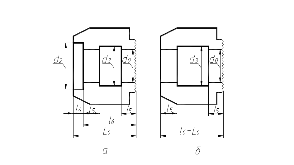 6. Производится определение размеров, выточек. У круглых насадных фасонных резцов шириной менее 15 мм выточки в отверстии не выполняют. У резцов шириной более 15 мм для лучшего их центрирования и закрепления на оправке внутри тела резца предусматривают выточки. У круглых резцов с односторонним креплением с левой стороны, то есть со стороны, противоположной рифлениям, делают выточку для размещения головки оси, на которой крепится резец, а внутри резца располагают выточку для уменьшения посадочной поверхности (см. рис. 6.3, а).