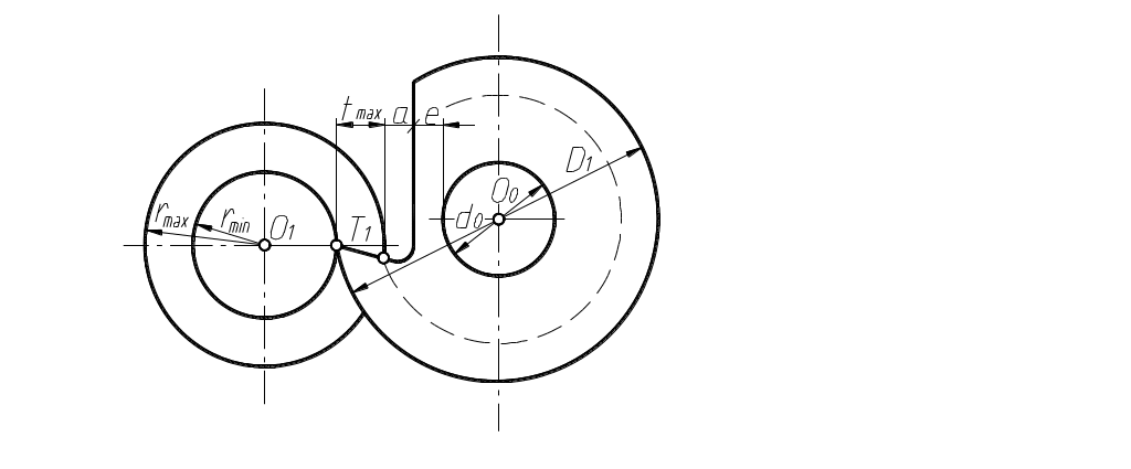 где d0 - диаметр посадочного отверстия резца, мм; tmax - наибольшая глубина профиля детали, мм; а - запас по длине передней грани фасонного резца для обеспечения - свободного схода стружки, мм; е - толщина стенки резца, мм.