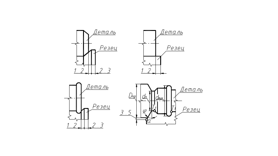 где L - длина детали, мм; l2 - ширина дополнительной режущей кромки со стороны прутка, мм; l3 - ширина дополнительной режущей кромки со стороны открытого торца детали, мм. Величины l2 и l3 определяются точно так же, как для круглых фасонных резцов. Полученное значение общей ширины резца округляется до целого числа за счет дополнительной режущей кромки со стороны прутка.