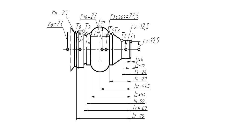 После определения радиусов всех узловых точек, производится преобразование их осевых координат. В результате проведенных преобразований координаты всех узловых точек должны быть заданы парами значений (l1;r1), где l1 - осевая координата точки Т1 (как правило, расстояние до одного из торцов детали), а г1 - радиус детали, соответствующий точке Т1. На рис. 4.2 приведена схема, иллюстрирующая преобразование чертежа детали (рис. 4.1) к виду, удобному для дальнейшего расчета.