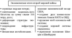Последствия: людские потери (55 млн. человек) (1/2 — потери СССР); материальные потери (Европа и СССР); кризис экономик стран-учасниц; рост богатства США, на долю США приходилось 2/3 мирового промышленного производства — супердержава.
