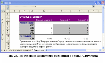 Диспетчер сценарієв виводить на монітор робоче вікно Диспетчера сценариев в режимі Структура (рис. 22). Слід відмітити, що автоматично Диспетчер сценариев формує новий робочий лист надаючи йому назву Структура сценариев (рис. 22).