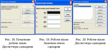 Сценарій відноситься до інструментарію, що іноді називають інструментом аналізу "що - якщо". Сценарій – це набір значень, які Microsoft Excel зберігає й може автоматично підставляти у робочий лист. Сценарії можна використати для прогнозу результатів розрахунків. Існує можливість створення й збереження у робочому листі різних групи значень, а потім перемикання на кожний із цих сценаріїв для перегляду різних результатів.