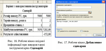 Загальний підхід. Після оформлення вхідної інформації у відповідному вигляді (див. рис. 16) послідовність команд Сервис Сценарии… приводить до виклику Диспетчера сценария, який виводить на монітор робоче вікно Добавление сценария (рис. 17). За його допомогою можна: додавати новий сценарій під деякою назвою до множини сценаріїв, вилучати невдалий чи редагувати його, виводити на екран результати застосування сценарію, створювати звіт за всіма сценаріями, скористатися зі сценаріїв, створених на інших сторінках.
