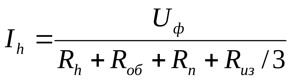 где Uф - фазовое напряжение сети, В; Rh - сопротивление тела человека, Ом; Rоб - сопротивление обуви; Rп - сопротивление пола, Ом; R0 - сопротивление заземления нейтрали источника тока, Ом.