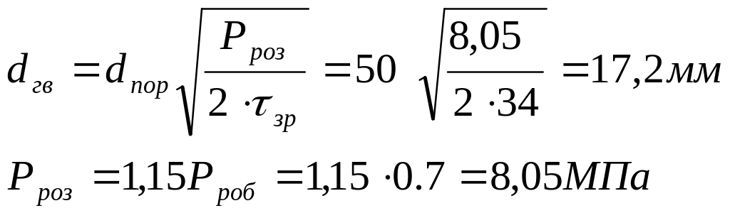 Для усунення небезпеки поломки поршневого насосу і нагнітальної лінії на насосі встановлений запобіжний клапан гвіздкового типу. Розрахувати діаметр гвіздка при роботі з тиском 0,7МПа. Границя міцності на зріз матеріалу гвіздка 34МПа, діаметр поршня 50мм.