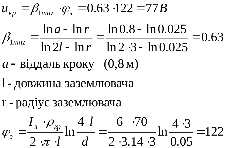 Визначити максимальну напругу крока UКР (одна нога знаходиться на заземлювачах) при одиночному стержневому заземлювачі з довжиною l = 3м, діаметр d = 50мм., питомий опір гранта g = 70 Ом*м. Струм замикання на землю І3 = 6 А.
