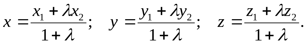 Если точка М(х, у, z) делит отрезок АВ в соотношении , считая от А, то координаты этой точки определяются как: