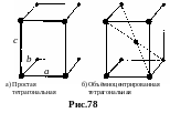 б. Тетрагональная система. Решетка Браве – прямая квадратная призма. Существует два типа – простая и объемноцентрированная (рис.78). а = b c, = = =90°.