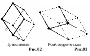 ж. Ромбоэдрическая система. Решетка Браве – ромбоэдр, то есть сжатый в направлении пространственной диагонали куб. Все грани ромбоэдра одинаковые ромбы. а = b = c, = = 90°. Решетка Браве простая (рис.83).