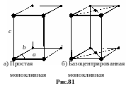 д. Моноклинная система. Решетка Браве есть прямая призма, в основании которой лежит произвольный параллелограмм. а b c, 90°, = =90°. Существует два типа решетки Браве моноклинной системы – простая (рис.81-а) и базоцентрированная (рис. 81-б).