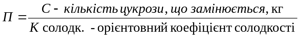Дозування підсолоджувачів (П) розраховують виходячи із орієнтовного коефіцієнта солодкості, а потім уточнюють за результатами дегустації: