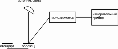 На рисунках приведены две основные схемы спектрофотометров, измеряющих спектральный апертурный коэффициент отражения данного объекта относительно рабочего стандарта с известной спектральной характеристикой: