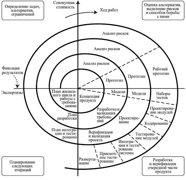 Спиральная модель, предложенная Барри Боэмом в 1988 году, стала существенным прорывом в понимании природы разработки ПО. Она представляет собой процесс разработки программного обеспечения, сочетающий в себе как проектирование, так и постадийное прототипирование с целью сочетания преимуществ восходящей и нисходящей концепции, делающая упор на начальные этапы жизненного цикла: анализ и проектирование. Каждый виток спирали соответствует созданию фрагмента или версии программного обеспечения, на нем уточняются цели и характеристики проекта, определяется его качество и планируются работы следующего витка спирали. Таким образом углубляются и последовательно конкретизируются детали проекта и в результате выбирается обоснованный вариант, который доводится до реализации. Каждый виток разбит на 4 сектора: