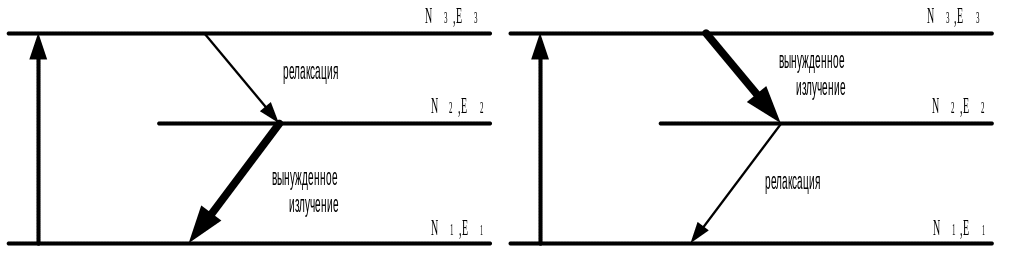 3. Для виключення самопоглинання, що приводить до переходів Е1→Е2 і E3→E4 бажано, щоб процеси релаксації здійснювалися за рахунок неоптичних (безвипромінюючих) переходів.
