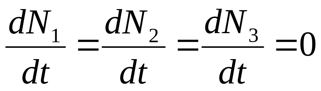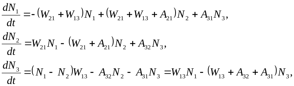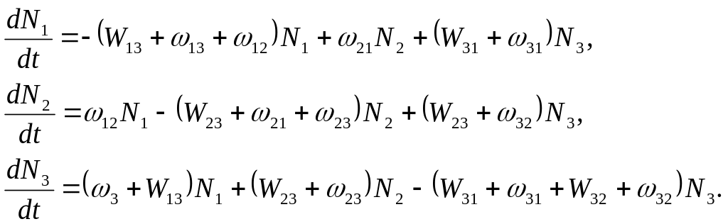 де W13,W32 – імовірності змушених переходів; ik – імовірності безвипромінювальних переходів між рівнями 1, 2, 3.Тому що сума всіх трьох рівнів при будь-якому розподілі часток по рівнях залишається постійної, то