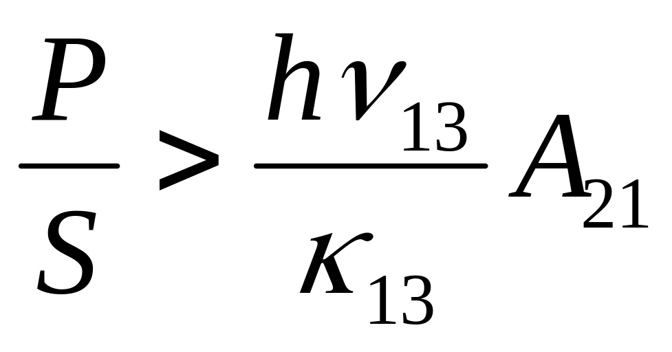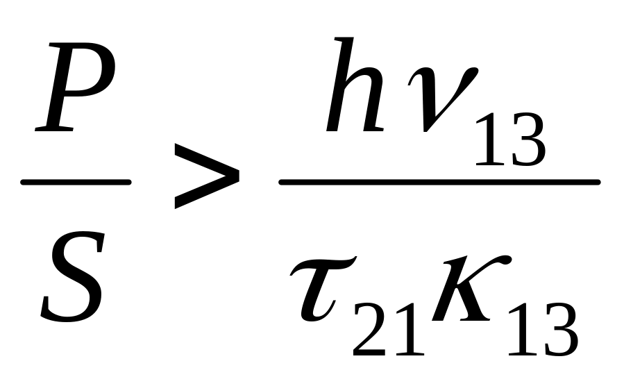 де Р – потужність накачування в смузі частот поглинання активної речовини; 13 – ефективний перетин поглинання для переходу квантових часток з рівня 1 на рівень 3 на частоті 13; S – площа поверхні робочої речовини, що піддається випромінюванню; 21 – час життя часток на рівні 2.