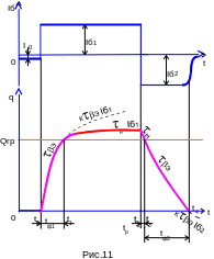 В соответствии с дифференциальным уравнением, описывающим переходные процессы в транзисторном ключе, можно получить аналитическое выражение переходной характеристики транзистора, т.е. его реакцию на скачкообразное управляющее воздействие. Решением дифференциального уравнения первого порядка является экспоненциальная функция. При включении транзистора заряд неосновных носителей в базе, или ток коллектора изменяются по нарастающей экспоненте, при выключении по спадающей экспоненте. Однако, в зависимости от режима работы транзистора, на разных этапах переходного процесса постоянная времени экспоненты будет различной. Вид переходной характеристики показан на рис. 11.