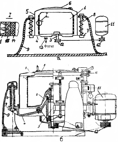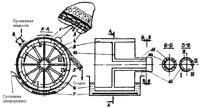 сетка. 3. Фильтровальная ткань. 4. Осадок на барабане. 5. Нож для съема осадка. 6. Корыто для суспензии. 7. Качающаяся мешалка. 8. Устройство для подвода промывной жидкости. 9. Камеры барабана. 10. Трубы, объединенные во вращающуюся часть 11 распределительной головки, поочередно соединяющие камеры 9 барабана 1 с секциями неподвижной части 12 распределительной головки.