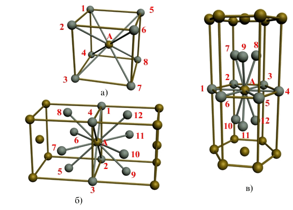 Рис. 1.3. Координационное число в различных кристаллических решетках для атома А: