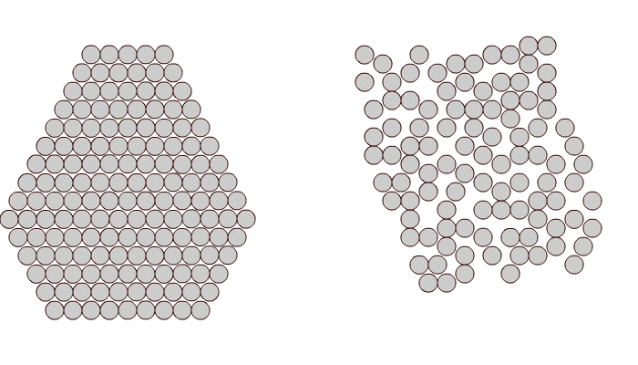 Рис. 1.1. Расположение атомов в кристаллическом (а) и аморфном (б) веществе