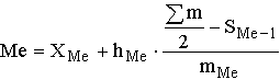 где XMe – нижняя граница медианного интервала; i – его величина; (Sum f)/2 – половина от общего числа наблюдений или половина объема того показателя, который используется в качестве взвешивающего в формулах расчета средней величины (в абсолютном или относительном выражении); SMe-1 – сумма наблюдений (или объема взвешивающего признака), накопленная до начала медианного интервала; fMe – число наблюдений или объем взвешивающего признака в медианном интервале (также в абсолютном либо относительном выражении).