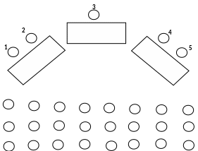 Блочный метод. В центре расположен стол ведущего, а с обеих сторон находятся столы сидящих напротив друг друга оппонентов. Такое расположение подходит для организации диспутов, дискуссий, круглых столов. Участники обеспечены микрофонами, при необходимости микрофоны устанавливаются в зале.