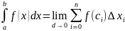 Если указанный предел существует независимо от выбора отмеченных разбиений, то функция f(x) называется интегрируемой(по Риману). Можно доказать, что если функция ограничена на отрезке [a;b] и непрерывна на нем, кроме, быть может, конечного числа точек разрыва, то она интегрируема.