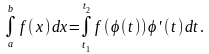 Теорема. Если функция f(x) непрерывная на отрезке [a; b], а функция x=φ(t) непрерывно дифференцируема на отрезке [t1; t2], причем φ([t1; t2])=[a; b] и φ(t1)=a, φ(t2)=b, то справедлива формула: