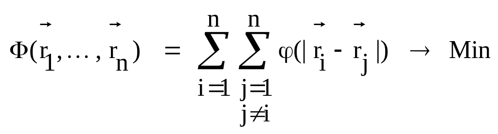 Будем искать расположение атомов, соответствующих минимуму полной энергии системы атомов. При этом саму энергию системы атомов не будем считать искомой величиной, тогда постоянный множитель в последнем выражении можно опустить. В итоге получаем многомерную задачу оптимизации (без ограничений) следующего вида: