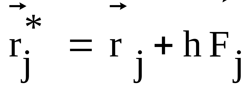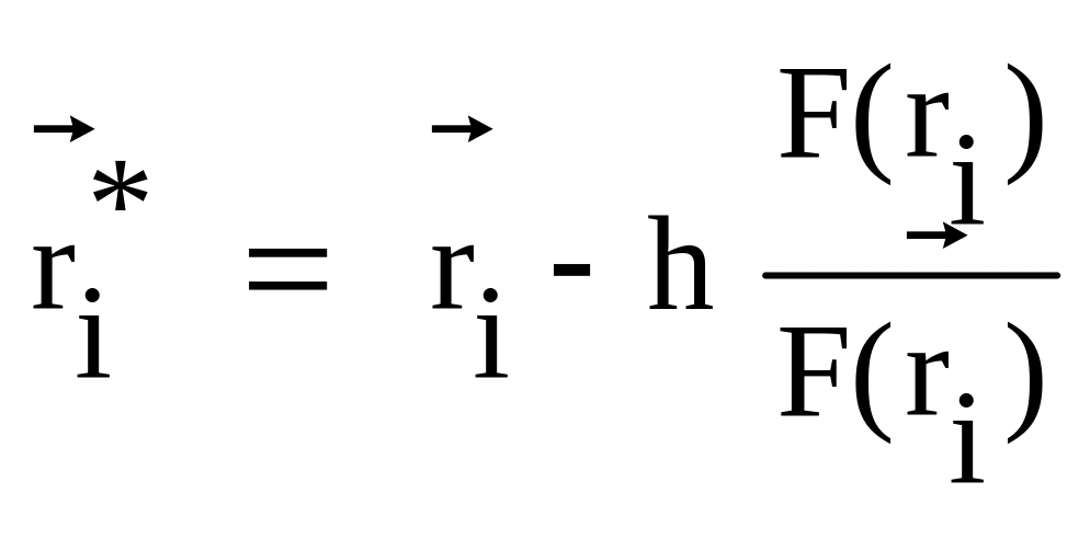 При моделировании процессов кристаллизации даже для небольших кластеров размерность такой задачи очень велика: для двумерного случая она равна 2n, а для трехмерного. – 3n, где n – число атомов. Для решения задачи может быть использован метод ГГР (групповая градиентная релаксация, В. Пинчук). Рассмотрим физическую интерпретацию этого метода для рассматриваемой задачи. Парный потенциал взаимодействия между атомами (r), где r - расстояние между атомами, обуславливает силу, действующую на один атом со стороны другого: