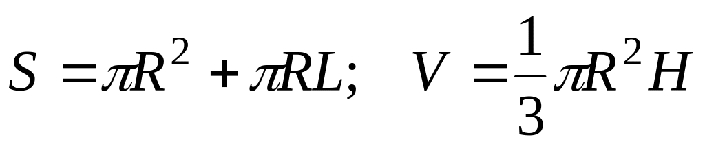 Пусть требуется составить программу вычисления общей поверхности и объема конуса по заданным радиусу основания R и длине образующей L. При вычислениях использовать равенства: