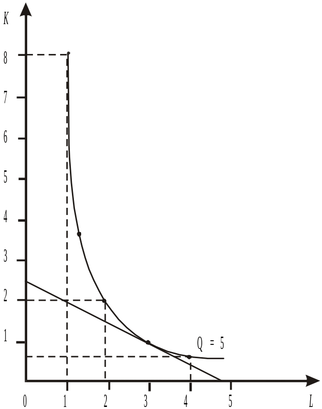 Підібравши декілька значень для L, знайдемо відповідні значення для К і на їх підставі побудуємо ізокванту, що відповідає обсягу виробництва в 5 одиниць продукції.