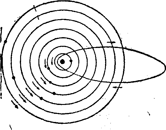 Таким же образом, по Декарту, плавают и планеты в мировом пространстве, так как они, будучи раз приведены в движение, движутся в одном и том же направлении. Но ньютоновская гипотеза тяготения объясняла иначе те же самые факты, и было трудно решить, которая из двух гипотез правильнее. Поэтому необходимо было открыть какой-нибудь такой факт, который согласовался бы с одной гипотезой и находился бы в противоречии с другой. Такой факт оказался. Именно Ньютон показал, что движение комет не находится в согласии с теорией Декарта. Кометы движутся не в том направлении, в каком движутся планеты, а проходят через весь круговорот Солнца (рис. 31). Если бы правильна была гипотеза Декарта, то кометы должны были бы, увлекаемые общим вихрем, двигаться в том же направлении, в каком двигались планеты. Этим фактом опровергалась гипотеза Декарта. Но с гипотезой тяготения движение комет находилось в полном согласии.