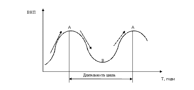 В двухфазовой модели выделяют повышательную фазу (подъема, экспансии) и понижательную фазу (спада, рецессии), а также высшую и низшую поворотные точки цикла (точки А и В на рис.4.1).