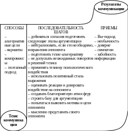 - в-третьих, содержание процедурных компонентов. А оно может быть заключено в рамки: стремление сформировать психофизиологическую атмосферу взаимодействия; создать условия для утверждения или опровержения тезиса (стать приятным собеседником, заинтересовать, расположить к себе оппонента, добиться от него согласия на сотрудничество); намеренно ослабить или заменить возражения оппонента на желание рассмотреть наши доводы по тезису.