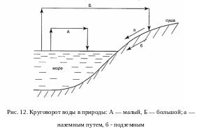 При малом круговороте испарившаяся вода возвращается в моря и океаны. При большом круговороте после выпадения на сушу вода возвращается в море путем поверхностного стока и путем подземного стока в виде подземных