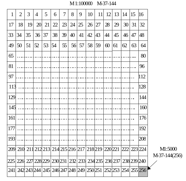 Для получения плана М 1:500, планшет М 1:2000 делят на 16 частей и обозначают арабскими цифрами от 1 до 16.